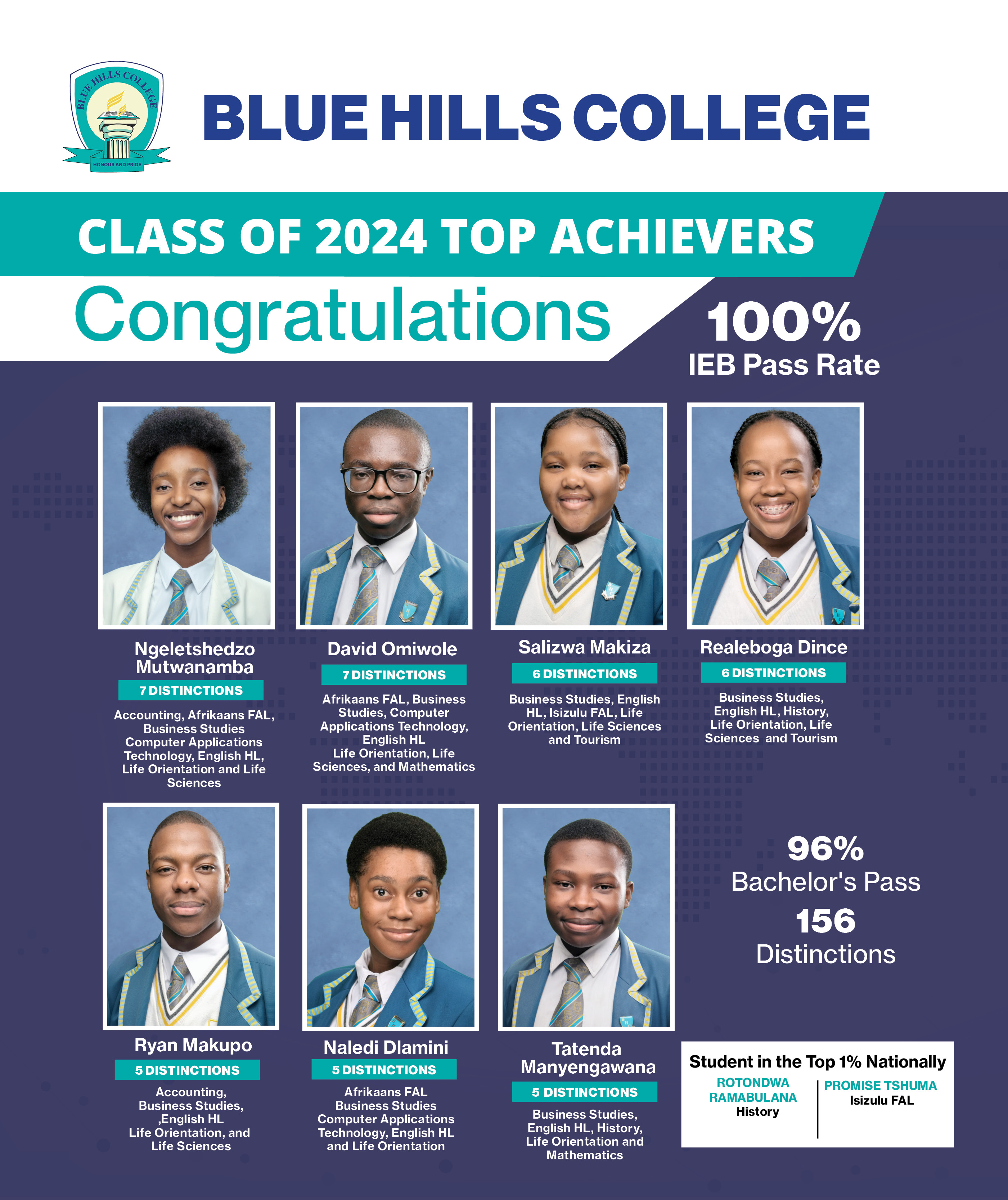 Blue Hills College, Class of 2024 achieved outstanding results with a 100% pass rate, 96% Bachelor's Pass, and 156 distinctions.